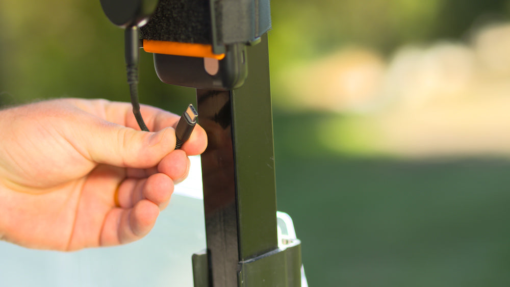 We provide a 3 AMP, USB-C, charging cable out of the box so you are always juiced up.